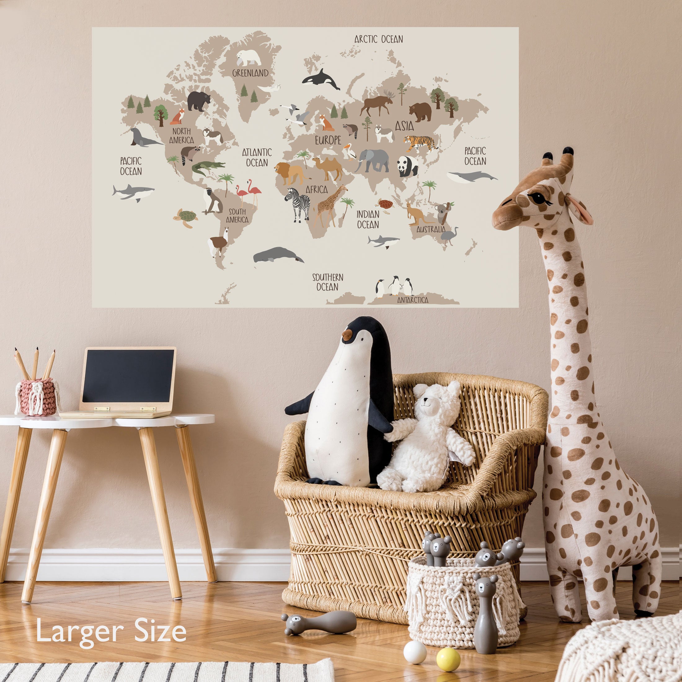 Neutral World Map Wall Decal, Animal World Map Wall Sticker, Kids